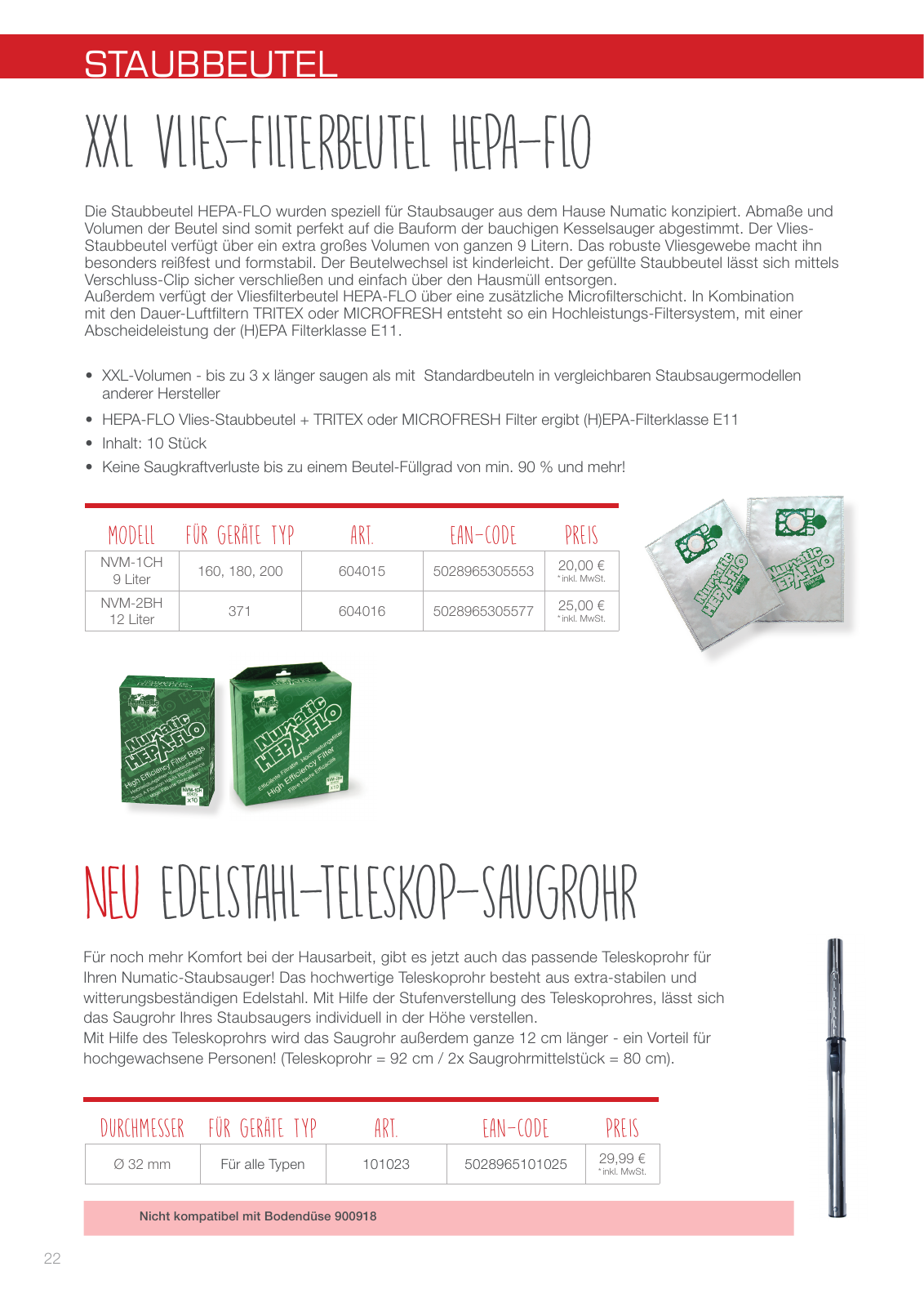 PREISLISTE 2016 Modell Art Nr EAN Code Farbe UVP brutto NUV180 11 903391 5028965695272 lime green 139 00 JDS181 11 900140 5028965611456 summer blue 159 00 HVR160 11 903372 5028965694893 classic red 199 00 HET160 11 903371 5028965694879 classic pink 199 00 HVB160 12 Verfügbar ab April 2017 HVR200 11 903383 5028965695098 classic red 199 00 HET200 11 903384 5028965695135 classic pink 199 00 HDK201 11 900141 5028965611470 classic red 229 00 HDK202 11 900142 5028965611494 summer blue 229 00 HDK203 11 900143 5028965611531 apple green 229 00 HDK205 11 900145 5028965611555 classic pink 229 00 HDH201 11 900147 5028965611616 classic green 259 00 HDX201 11 900146 5028965611579 classic red 289 00 HXL221 11 900148 5028965611593 classic red 289 00 CDC371 2 900149 5028965611630 classic blue 279 00 GDE371 2 900150 5028965611654 classic green 419 00 Es gelten unsere allgemeinen Geschäftsbedingungen die wir Ihnen auf Wunsch gerne zuleiten Alle angegebenen Preise verstehen sich in EUR Stück Irrtümer und Änderungen vorbehalten ÜBERSICHT Numatic HEPA FLO Vliesfilterbeutel Der Numatic HEPA FLO Staubbeutel ist ein mehrlagiger Vliesfilterbeutel mit zusätzlicher Microfilterschicht Er hat ein extra großes Filtervolu men NVM 1CH 9 Liter NVM 2BH 12 Liter ist enorm reißfest einfach zu wechseln und mit einem Clip verschließbar In Verbindung mit dem Tritex Primärfilter oder dem Microfresh Filter wird die H EPA Filterklasse E11 erreicht Verpackungsinhalt 10 Beutel HEPA FLO VLIESFILTERBEUTEL STAUBBEUTEL 604015 HEPA FLO Hochleistungsfilter NVM 1CH Universalbeutel passend für Behältergrößen 6 9 L 20 00 UVP Brutto 604016 HEPA FLO Hochleistungsfilter NVM 2BH 25 00 UVP Brutto 22