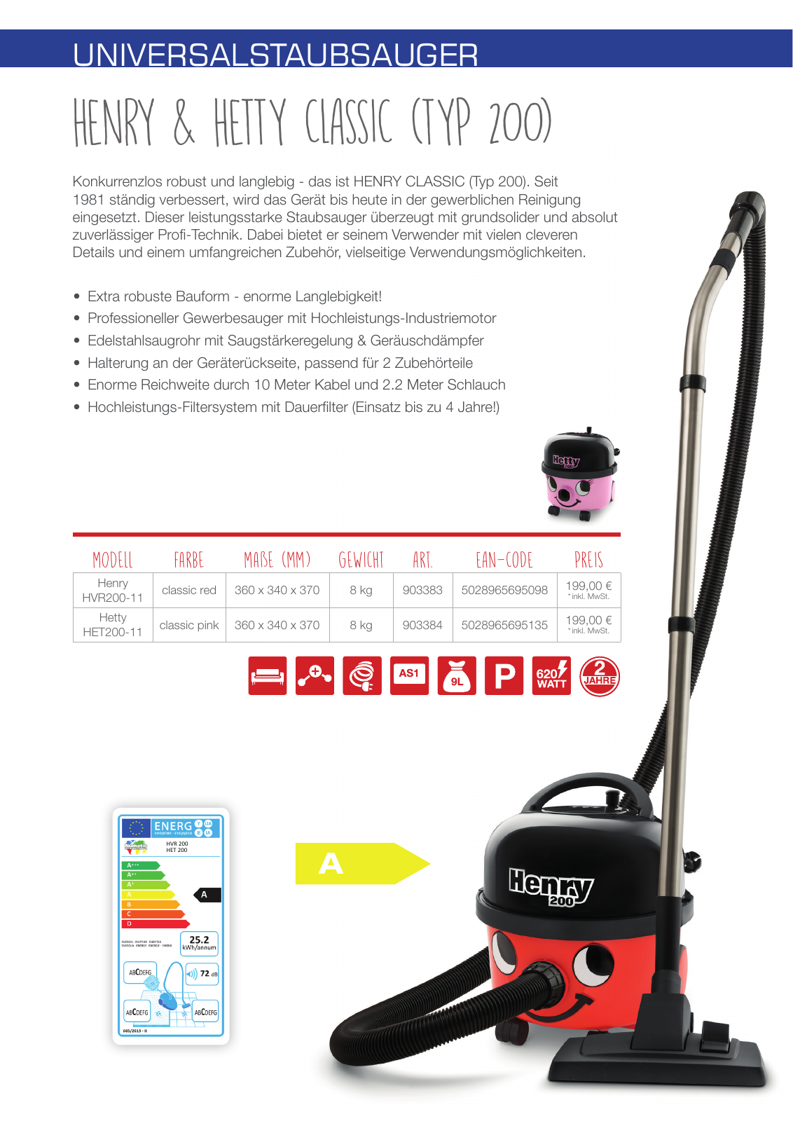 HENRY HDK201 11 Energiesparender geräuscharmer leistungsstarker 620 Watt Motor Staubbeutel H EPA Filterklasse E11 NVM 1CH Art 604015 Kabelaufrollsystem im Motorkopf mit umlaufendem Soft Stoßschutzring zum Schutz von Türen und Möbeln Parkfunktion mit Saugrohrhalterung zur leichten Aufbewahrung Inklusive umfangreichem Zubehör Set AS1 HE Bodendüse Zubehörhalterung mit stabilem dreiteiligen Edelstahlrohr 2 4 m FloMax Saugschlauch umschaltbare HiPro Kombidüse 290 mm Fugendüse HighEfficient HE Bodendüse mit Rollen Polsterdüse mit Bürstenaufsatz Möbelbürste Schlauchverbindung Inklusive 5 x HEPA FLO NVM 1CH Vliesstaubbeutel Art Nr 900141 EAN 5028965611470 UVP brutto 229 00 inkl MwSt Motor 620 W Nennspannung 230 V AC 50 HZ Behälterinhalt 9 Liter Kabel 10 m Gewicht 8 5 kg Abmessungen 360 x 340 x 370 mm Farbe classic red TECHNISCHE DATEN PRODUKTBESCHREIBUNG Irrtümer und Änderungen vorbehalten A A 25 2 kWh annum B C D E F G 665 2013 I 72 dB ABCDEFG ABCDEFG ABCDEFG HDK PR OF IPR ODUKT Übe r 9 M illion en verk auft e Ge räte 9